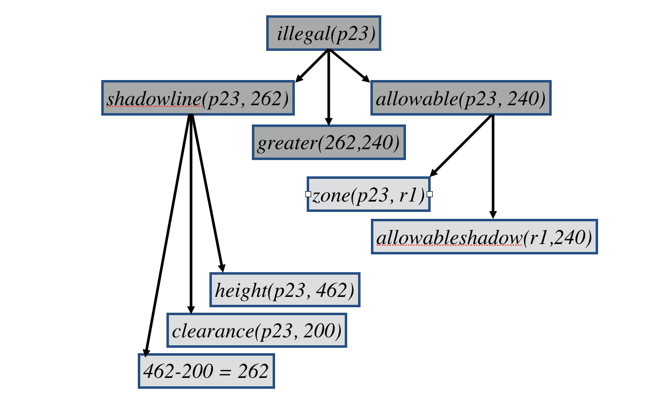 Using this derivation tree, the system can explain why the building plan was rejected by citing the actual shadow line of the building and comparing it to the allowable shadow line.