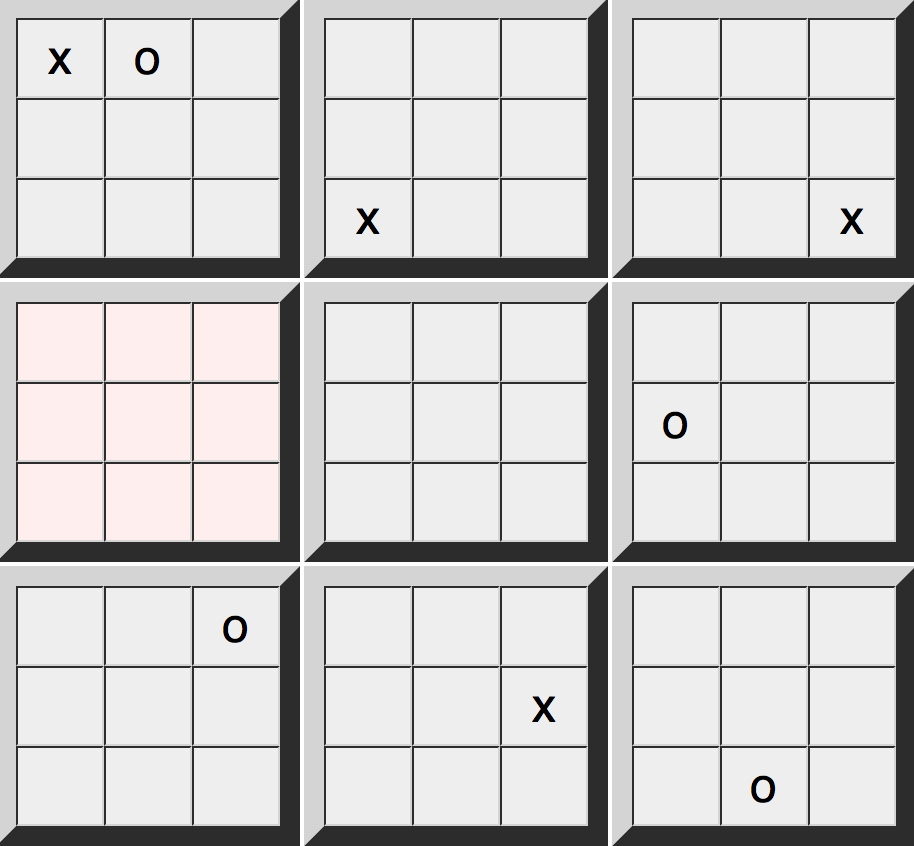 A sample state of the game is pictured below. As you can see, the X and O players have each made several plays. It is X's turn to play, and he is required to in the middle board on the left.